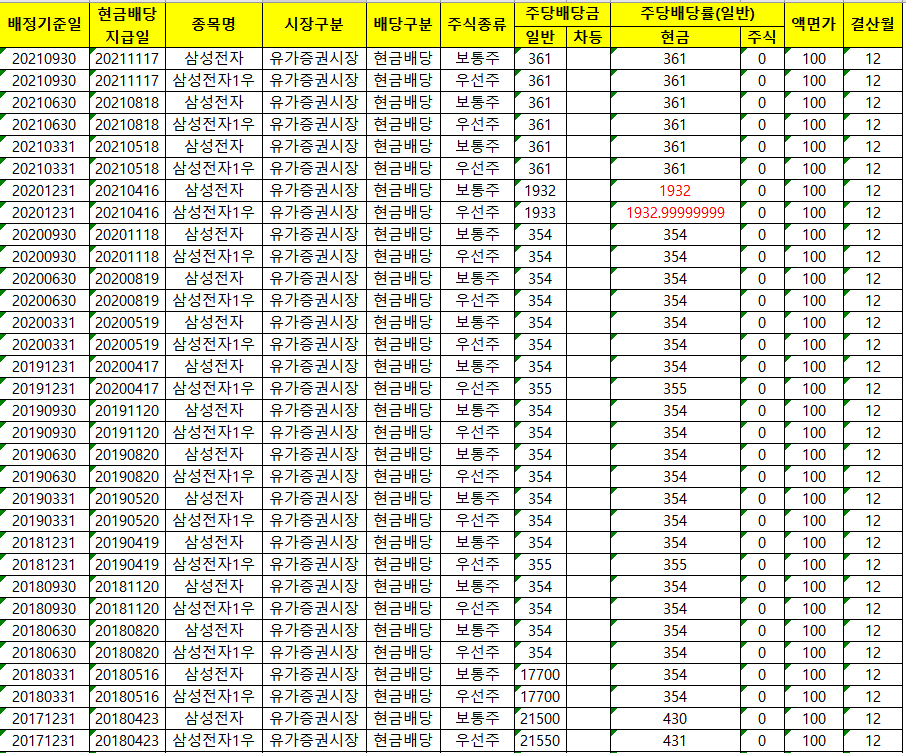 삼성전자 결산배당금 지급일은 다음년도 4월 16일에서 19일 사이에 입금이 됩니다. 제가 위에 적색표시를 해둔것은 2020년에 삼성전자가 특별배당금을 주당 1932원 지급한 것 입니다. 삼성전자우는 1원 더 줬네요.