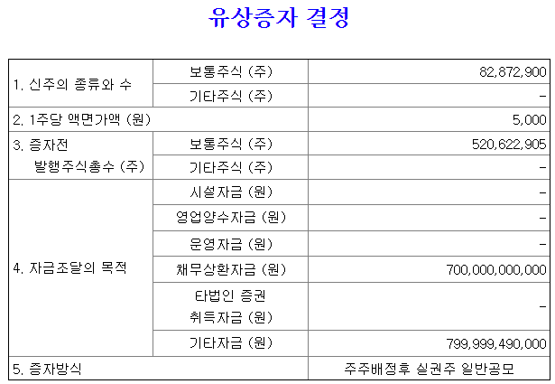 두산중공업의 현재 발행주식 총수는 5억2천만주 인데, 여기에 8287만 주를 발행하면서 총 1.5조원의 자금을 조달하게 됩니다. 자금 조달의 목적은 채무상환자금에 7천억원, 기타자금에 8천억원을 사용하겠다고 밝히고 있습니다.
