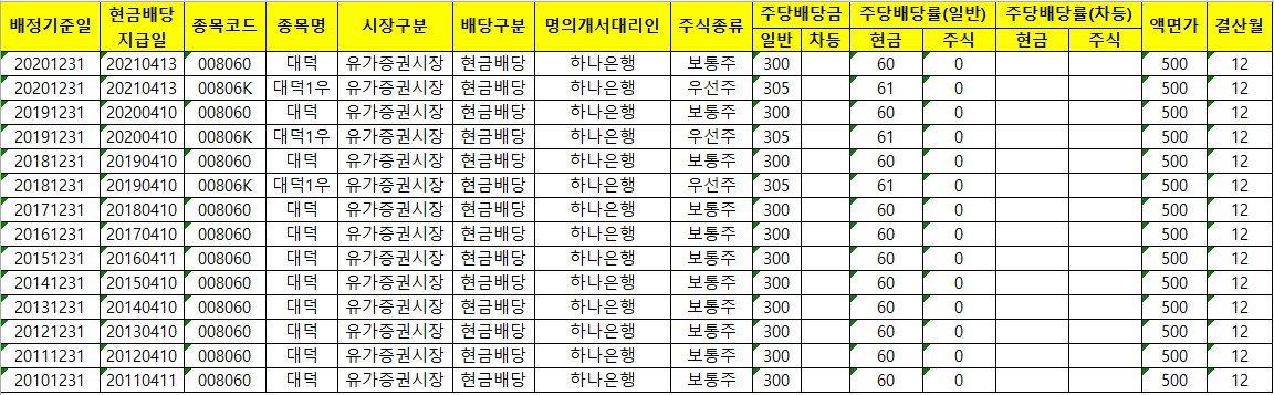 우리나라 주식회사들은 보통 12월이 결산법인 입니다. 즉 회계년도를 1월부터 12월까지 한다는것이죠. 또한 배당금을 지급하는 회사보다 안주는 회사가 훨씬더 많습니다. 아직 자본시장 역사가 짧기 때문이겠죠. 오늘 설명해드릴 대덕전자는 배당금을 매년 지급해 오고 있습니다. 분기배당(3월에 1번 지급하는 배당금)을 실시하는 회사도 늘어나고 있으나 대덕전자는 결산배당, 즉 년1회 배당금만 지급하고 있습니다.