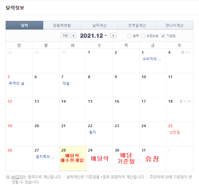 올해의 경우 12월 31일이 마지막 평일이기 때문에 31일은 주식시장 휴장일 입니다. 그럼 바로 전일인 30일이 배당기준일이 되는것 입니다.