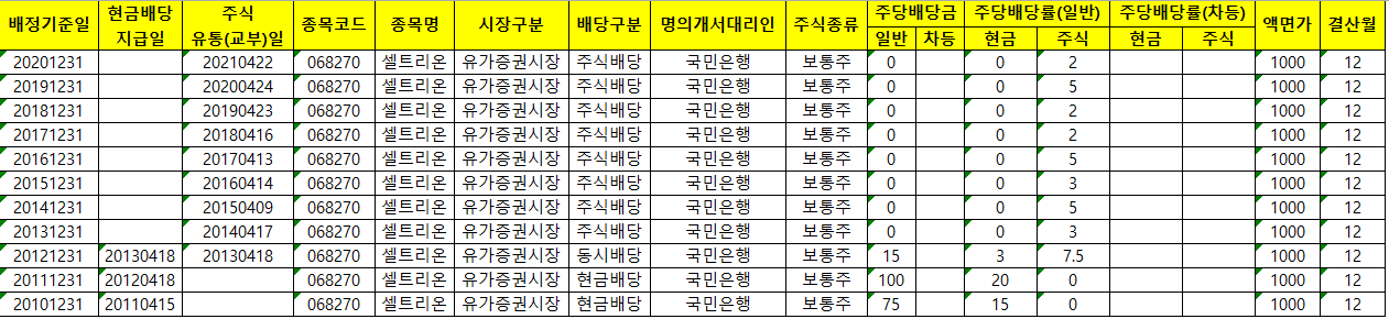 셀트리온 주식배당은 매년 아래와 같은 시기에 지급이 되었습니다. 아래 표를 한번 보시죠.