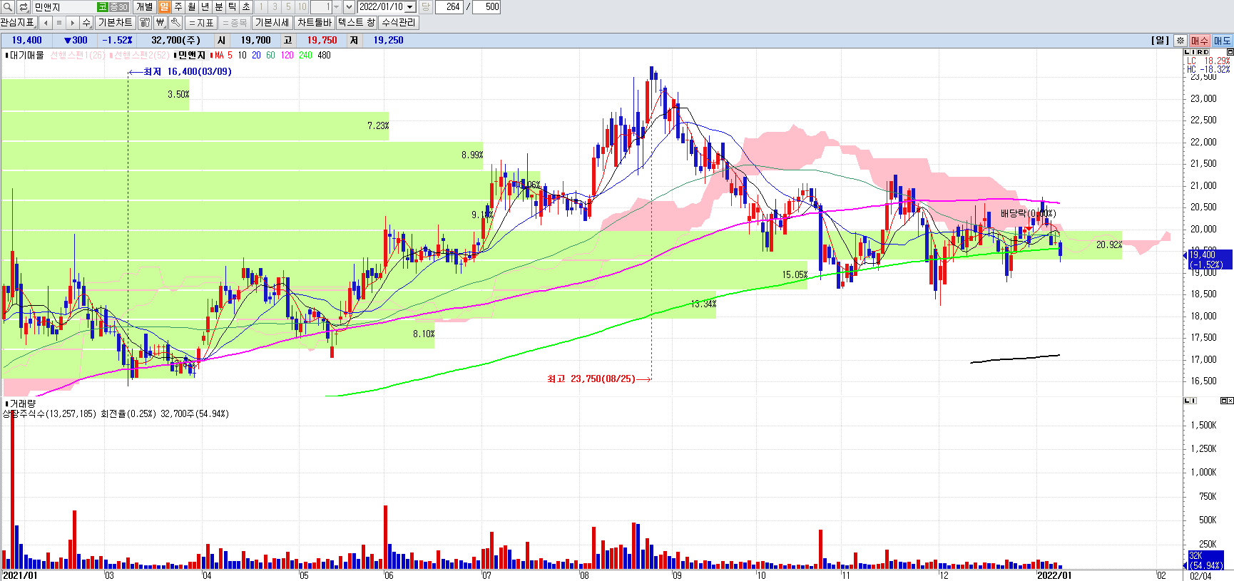 민앤지는 실적이 뒷받침 되어주고 있기 때문에 주가가 꾸준히 우상향으로 갈것으로 보고 있습니다. 이런 종목은 웬만하면 손절을 안하는게 좋겠죠.