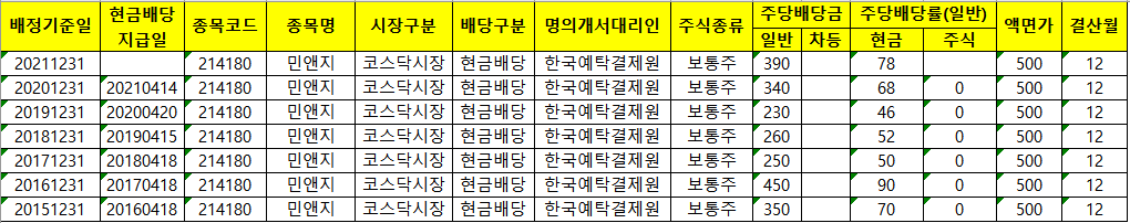 민앤지는 매년 4월 중순께 배당금을 지급해 온것을 보실수가 있습니다. 따라서 올해 민앤지 배당금 지급일은 4월 15일(금) 전후로 예상 됩니다.