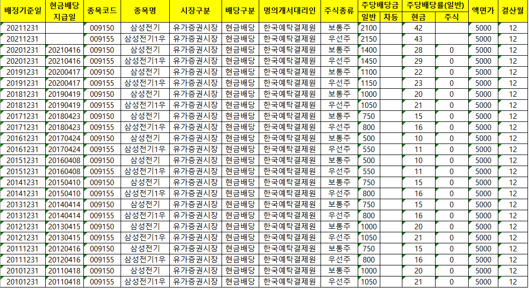 삼성전기 배당금은 매년 아래와 같은 시기에 지급이 되었습니다. 아래 표를 한번 보시죠.