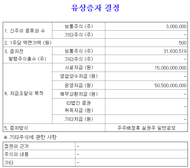 다원시스의 현재 발행주식 총수는 3160만주 인데, 여기에 300만주를 발행하면서 총 655억원의 자금을 조달하게 됩니다. 자금 조달의 목적은 시설자금에 150억원, 운영자금에 505억원을 사용하겠다고 밝히고 있습니다.