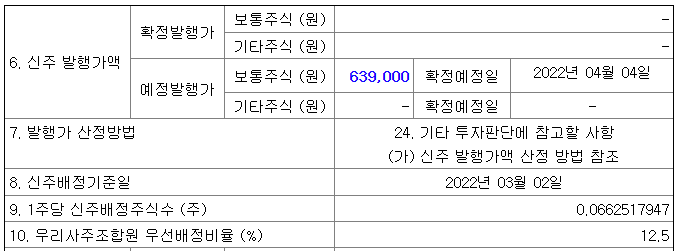 시초가가 하락하여 출발하는 이유는 신주발행가가 현재의 주가보다 낮기 때문에 그만큼 떨어져서 출발하게 되는것입니다. 예정발행가가 보이시죠? 예정발행가 수준에서 신주발행가가 결정되기 때문 입니다. 그러나 권리락 당일 곧바로 시초가가 회복하는 경우가 있으니 이때에 주식을 전부 매도 후 추후 신주인수권만 받아 팔아도 수익을 챙길 수 있으며, 또는 신주인수권을 가지고 유상증자에 참여하여 할인된 가격의 주식을 받을 수 있습니다. 이 주식 꿀팁은 아래에서 계속해서 설명 드리겠습니다.