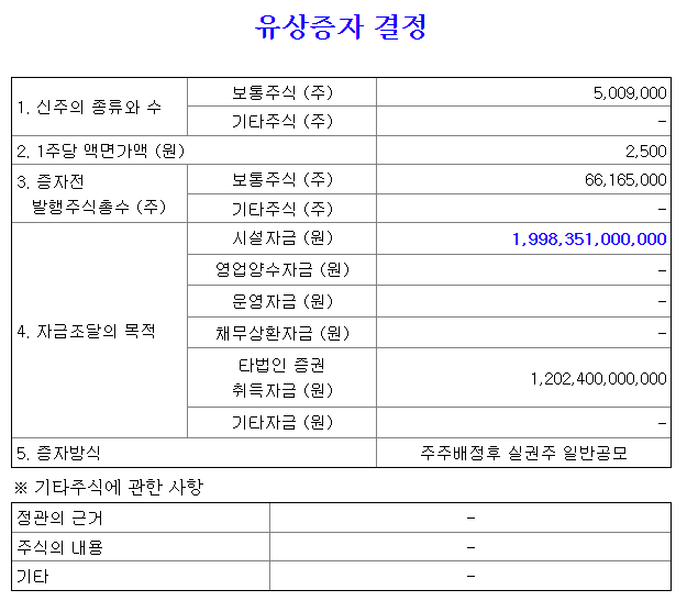 삼성바이오로직스의 현재 발행주식 총수는 66,165,000주 인데, 여기에 5,009,000주를 발행하면서 총 3조 2천억원의 자금을 조달하게 됩니다. 자금 조달의 목적은 타법인증권취득 자금에 1조 2천억원, 시설자금에 1조 9천9백억원을 사용하게 될 전망 입니다.