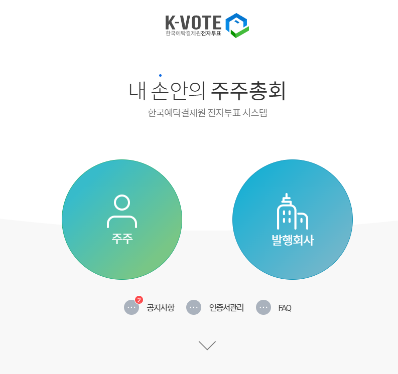 전자투표 사이트로 이동하시면 먼저 주주인지, 발행회사인지를 선택하셔야 합니다. 우리는 당연히 주주일것이기에 좌측에 주주란을 선택해 주세요.