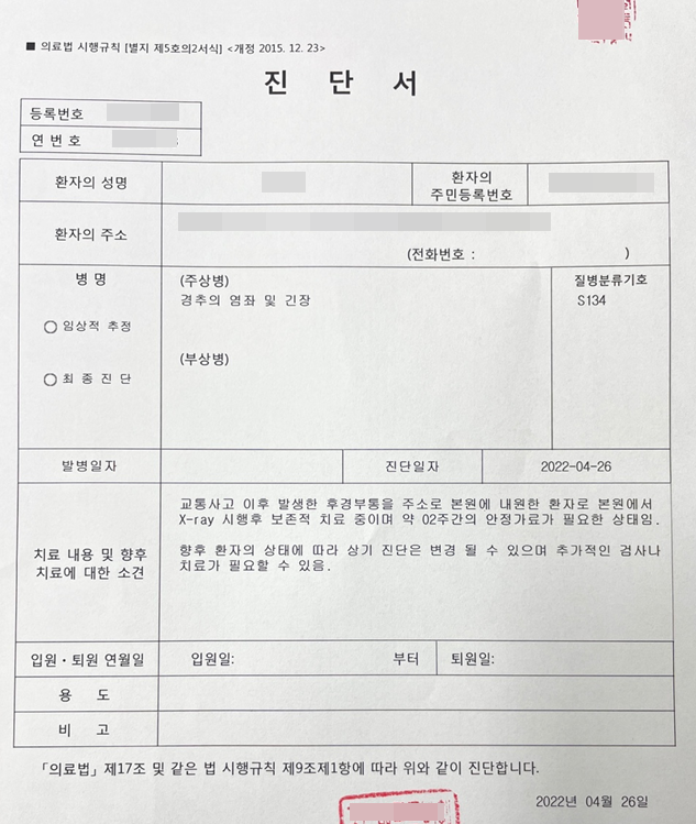 주변에 잘 찾아보면 자동차사고 전문병원이나 한방병원등이 있는데요. 해당 병원에 방문하셔서 자동차사고로 왔다고 이야기 하시고 의사와 상담후 '진단서'를 발급 받으셔야 합니다. 요추염좌나 경추염좌가 나오면 부상등급 14급은 무조건 나오기 때문에 해당 진단서를 가지고 내 보험사에 청구하는것이죠. 때문에 단독사고시에는 병원에 가셔서 진단서를 발급받으셔야 합니다.