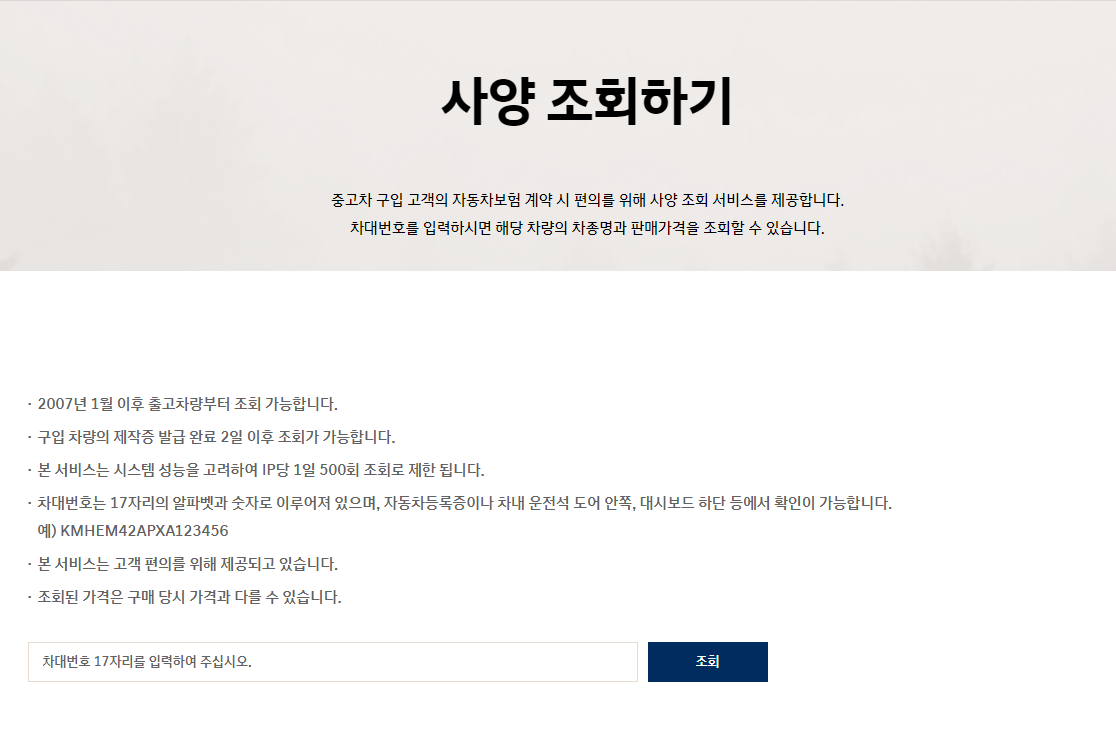 위 주소로 바로 들어가시거나, 네이버에 현대자동차 차대번호 조회라고 치시면 해당 사이트로 이동하게 됩니다.