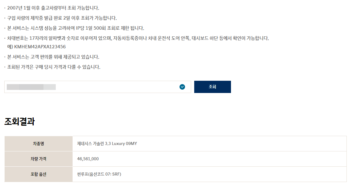 위 차대번호 17자리 입력란에 차대번호를 입력하시고 조회를 눌러 주세요. 그럼 아래와 같은 화면이 나오게 됩니다.