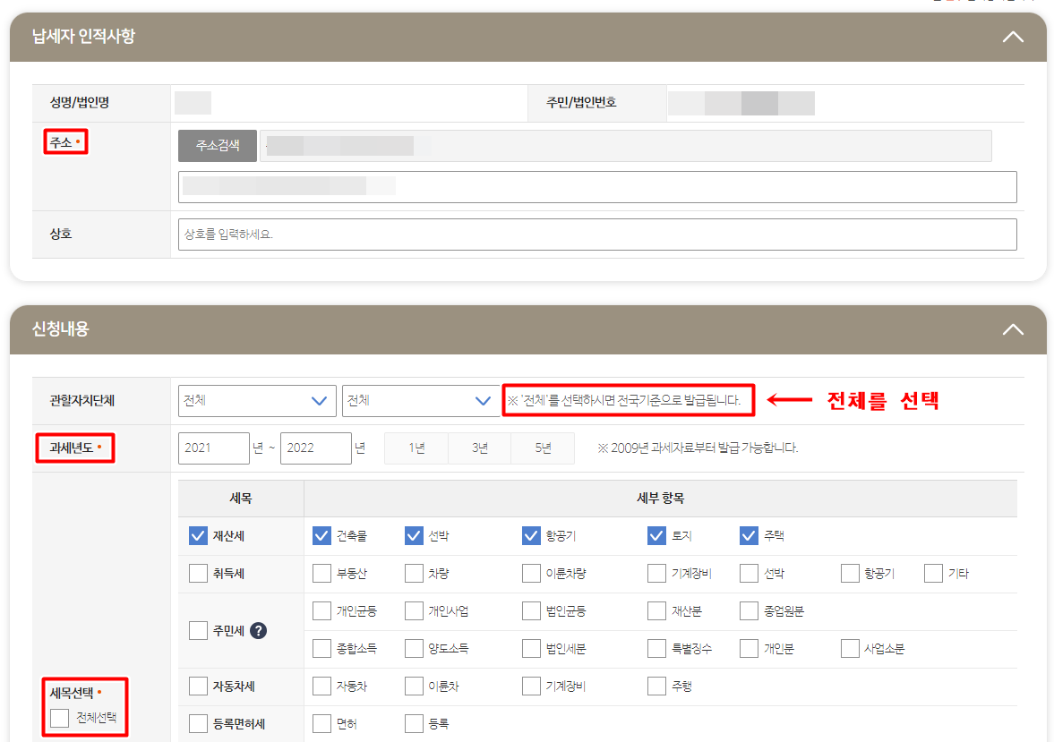 그리고 가장 중요한 관할자치단체를 전체로 해주는겁니다. 전체로 해야만 지방세 세목별 미과세증명서를 전국단위의 발급이 가능 합니다. 그리고 과세년도를 선택해 주시고요. 아래 어떠한 세목을 조회할지도 체크해 줍니다.