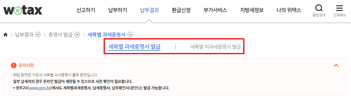 로그인을 하셨다면 아래 카테고리로 들어가 주세요. 상단의 납부결과에 마우스를 올려두시고 우측에 증명서 발급란에 세목별 과세증명서를 클릭해 주세요.