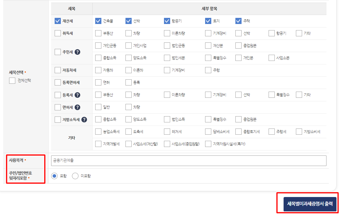 그 후 아래와 같이 세목별 과세증명서 발급을 할지, 세목별 미과세증명서를 발급할지 선택해 줍니다. 반드시 빨간* 표시가 된 항목은 체크하거나 작성해야 합니다.