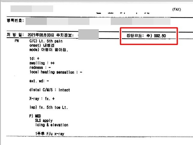 해당 고객은 아령이 발등에 떨어져 골절이 된 케이스 인데요. 진단코드 S92를 받아 왔습니다. S는 발과 발가락 부위를 말합니다.