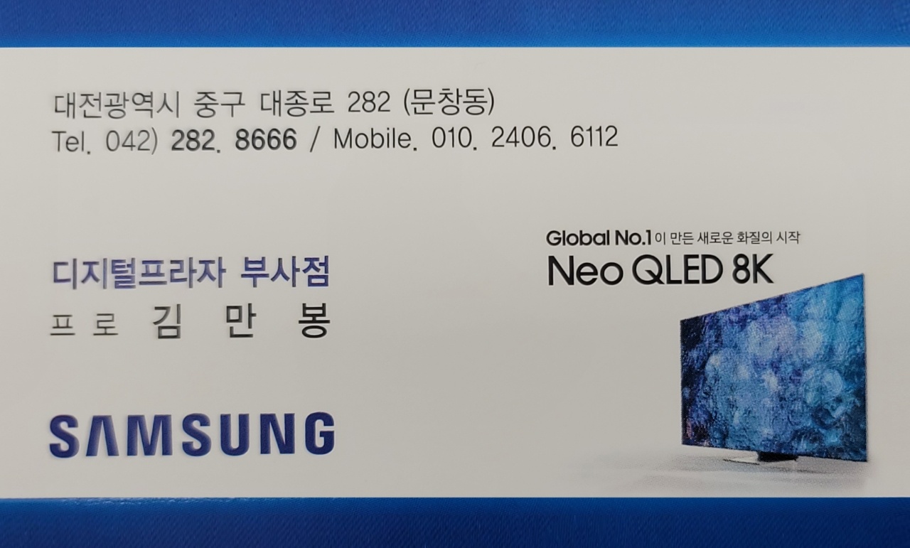 제가 개인적으로 발품을 팔아 인터넷보다도 싸게 구매했던 삼성 디지털프라자 부사점 담당자님 명함을 올려 드립니다. 내돈내산이니 가전제품 바꾸실 분들 있으면 한번 연락해보시기 바랍니다. 감사합니다.