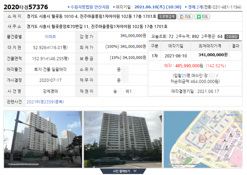 경기 시흥의 진주마을풍림아이원 1차 아파트 입니다. 전용 46평의 대형평수 인데 입찰자가 25명이나 몰리면서 142%에 낙찰 되었습니다.