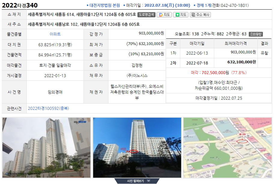 새뜸마을 12단지 물건 입니다. 학원가가 밀집해있고 나성동 먹자상권과도 인접하고 BRT 5분거리에 인접하여 세종에서 나름 상급지에 속하는 곳 입니다. 오늘 낙찰가율 77%에 입찰자가 겨우 3명이 들어 왔습니다. 불과 1년전과는 사뭇 다른 분위기 입니다.