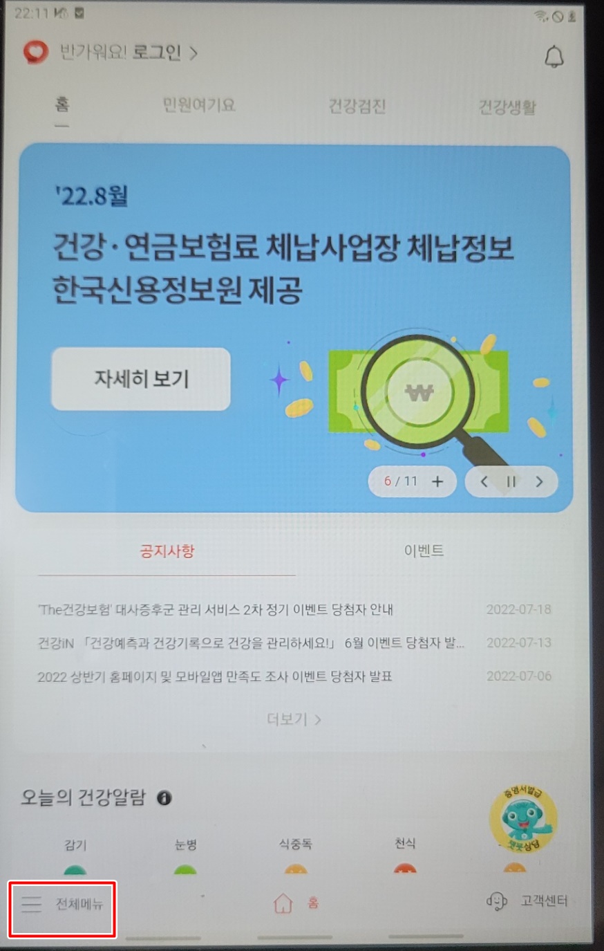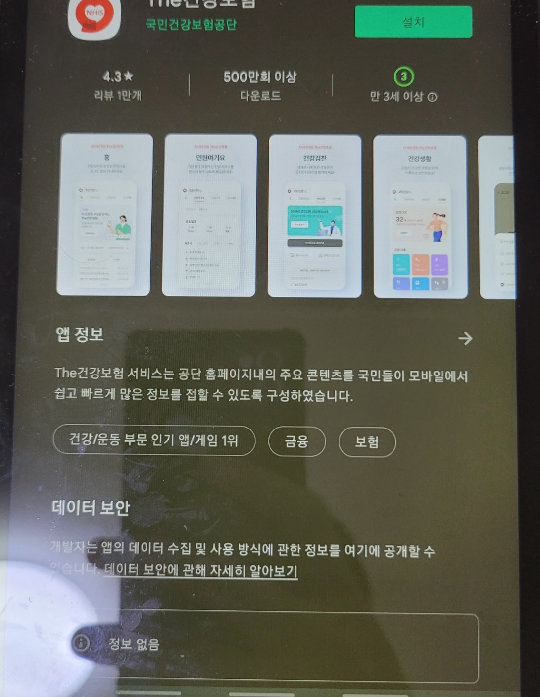보안상 캡쳐가 안되기에 다른 테블릿으로 접속후 사진을 찍었습니다. 위처럼 건강보험 관리공단 어플을 설치해 주시구요.
