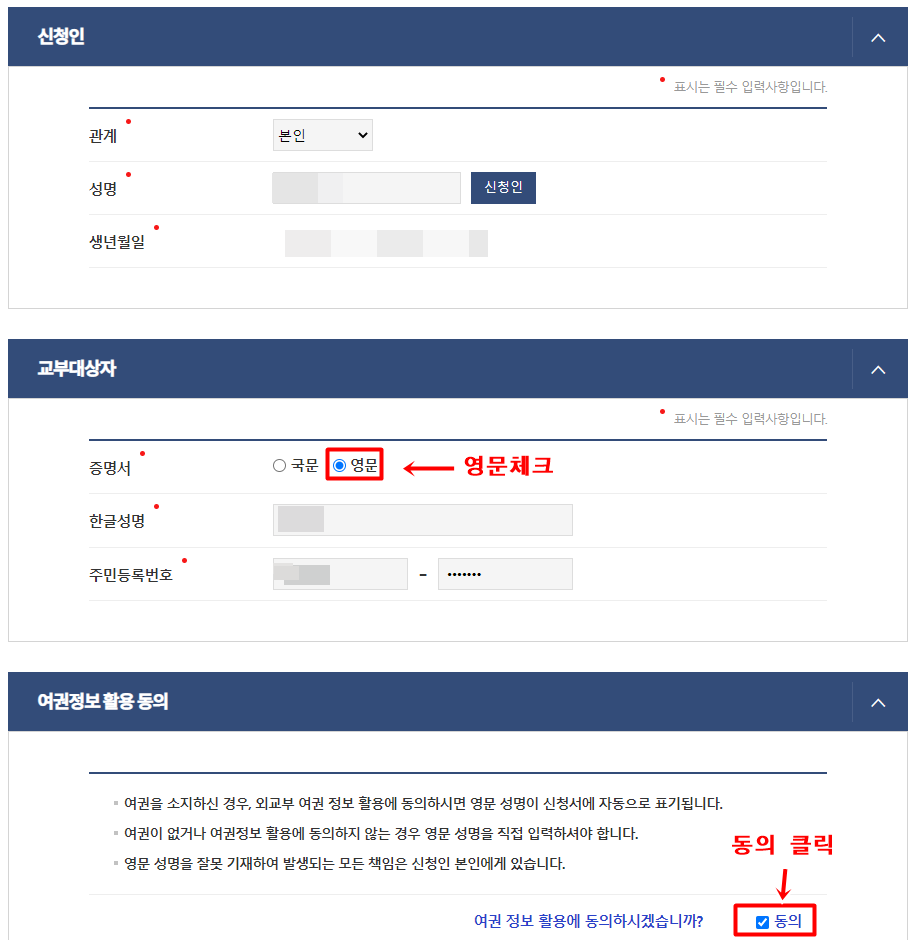 회원가입을 했기 때문에 개인정보는 자동으로 불러와 집니다. 중요한 것은 아래 교부대상자에서 영문으로 바꿔주시고 아래 여권정보활용에 동의에 체크 해 주시고 아래로 내려 주세요.