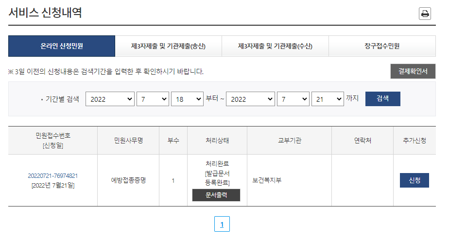 신청이 끝나면 이제 처리상태에 문서출력이 가능하게끔 보입니다. 문서출력을 눌러 주시면 발급이 가능 합니다. 프린터가 있는 컴퓨터에서 하던지, 아니면 PDF파일로 다운받으신 후 프린터기 있는 PC에서 출력해 주시면 됩니다.