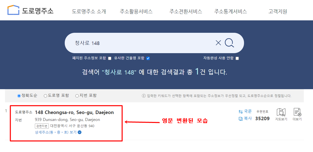 영문으로 전환이 잘 되었는지 체크해 주시구요. 우측에 복사 버튼을 누르면 자동으로 복사가 됩니다. 매우 간단하죠? 네이버에서 영문변경을 해도 되지만 저는 가급적 국가에서 운영하는 공인된 사이트에서 영문주소로 변환을 합니다.