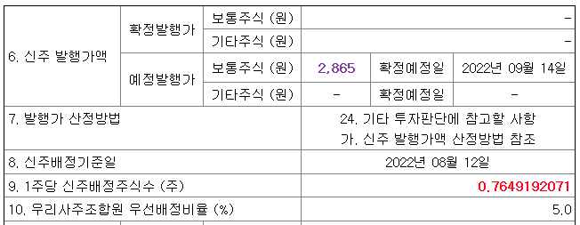 시초가가 하락하여 출발하는 이유는 신주발행가가 현재의 주가보다 낮기 때문에 그만큼 떨어져서 출발하게 되는것입니다. 예정발행가가 보이시죠? 예정발행가 수준에서 신주발행가가 결정되기 때문 입니다. 그러나 권리락 당일 곧바로 시초가가 회복하는 경우가 있으니 이때에 주식을 전부 매도 후 추후 신주인수권만 받아 팔아도 수익을 챙길 수 있으며, 또는 신주인수권을 가지고 유상증자에 참여하여 할인된 가격의 주식을 받을 수 있습니다. 이 주식 꿀팁은 아래에서 계속해서 설명 드리겠습니다.