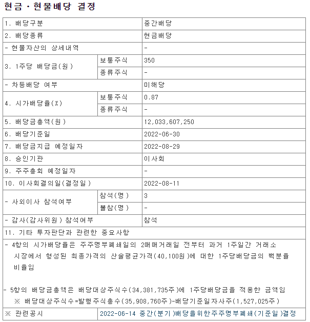 에스에프에이가 배당금 지급 공시를 했습니다. 에스에프에이는 지금껏 결산배당. 즉 1년에 1회만 배당을 실시 했었는데요. 최근 트렌드가 많은 기업들이 이제 분기배당을 실시함으로써 반기배당에 해당하는 중간배당을 발표 했습니다.