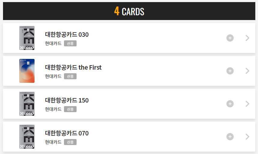 먼저 현대카드 대한항공030~150 신용카드 비교부터 해드리겠습니다.