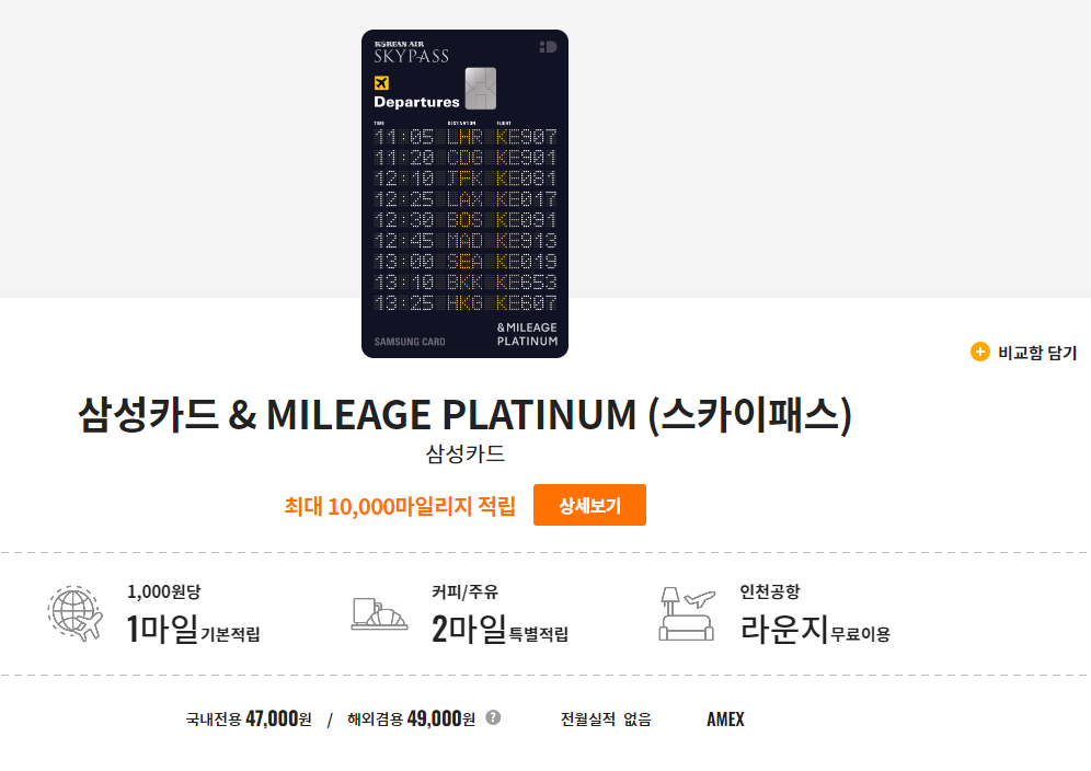 또한 공항라운지를 무료로 이용가능 하구요(PP카드), 해외겸용 연회비는 45000원 입니다. 또한 해외가맹점에서 결제시 1천원당 3마일의 적립률을 보여주니 해외여행시 꼭 가지고 나가야 하겠습니다. 다만 월 2천마일리지까지 더블적립이 되니 이점은 참고하시구요.
