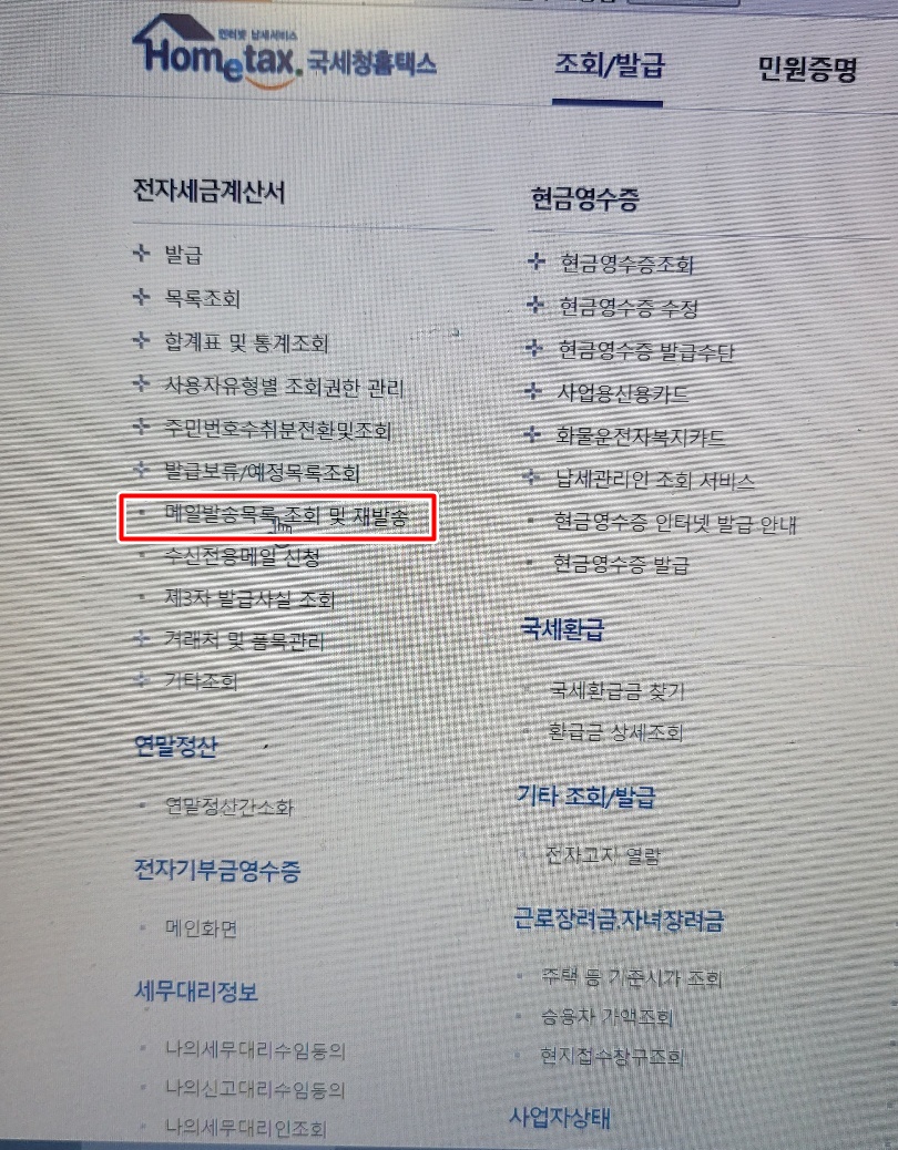 먼저 국세청 홈택스 사이트에 로그인부터 해주세요. 로그인을 해야 세금계산서 발송내역을 보실 수 있으니까요. 그다음 상단에 조회/발급 메뉴에 마우스를 올려두시면 카테고리들이 밑에 뜰텐데요. 여기서 전자세금계산서 목록의 메일발송목록 조회 및 재발송을 클릭 해 주세요.
