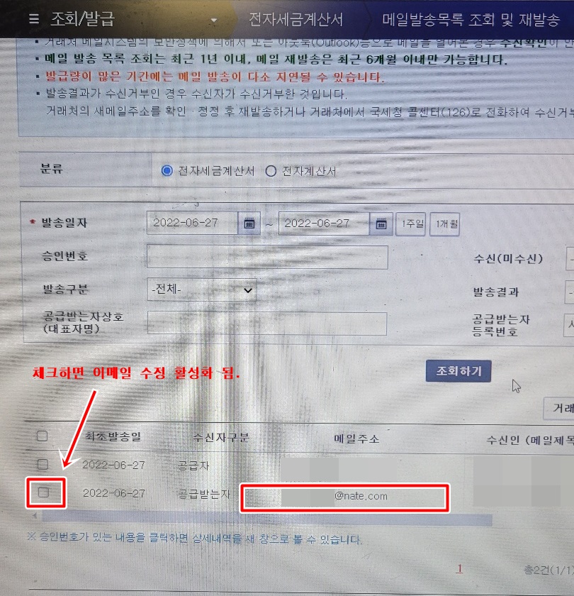 세금계산서가 발송된 날짜를 지정하고 조회를 하면 해당 기간동안 발행된 세금계산서 내역이 보이실겁니다. 아래 사진을 보면 아래 최초발송일, 수신자구분, 메일주소, 수신인(거래처명)이 뜰텐데요. 여기서 수정하고자 하는 항목 있죠? 그 항목의 제일 좌측에 체크하는 란이 있을겁니다. 그곳을 체크하면 다시 메일주소가 수정되게끔 활성화가 되실겁니다.