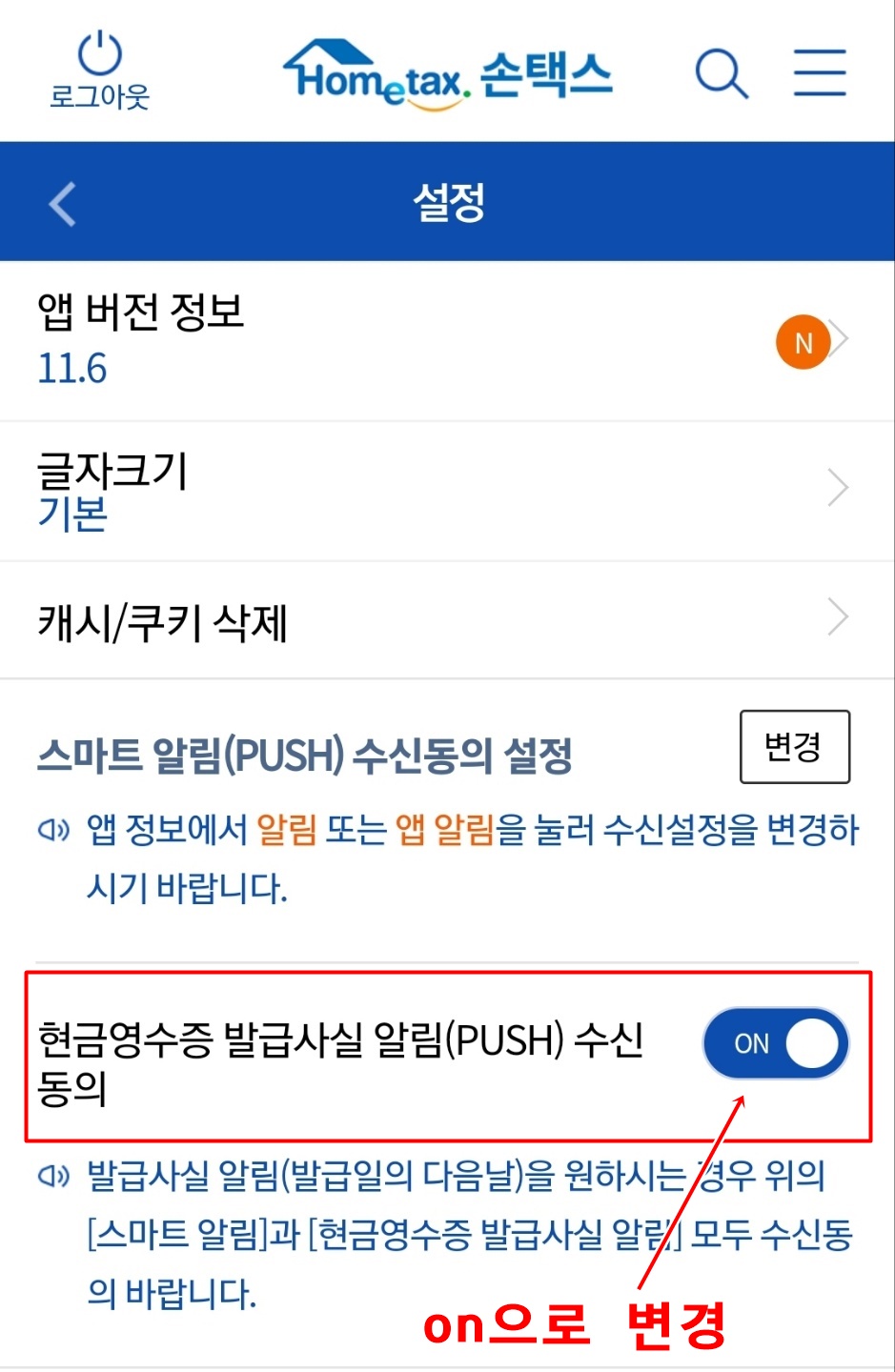 그리고 아래와 같이 현금영수증 발급사실 알림 수신에 동의(ON으로 변경) 하시면 끝 입니다. 참 쉽죠?