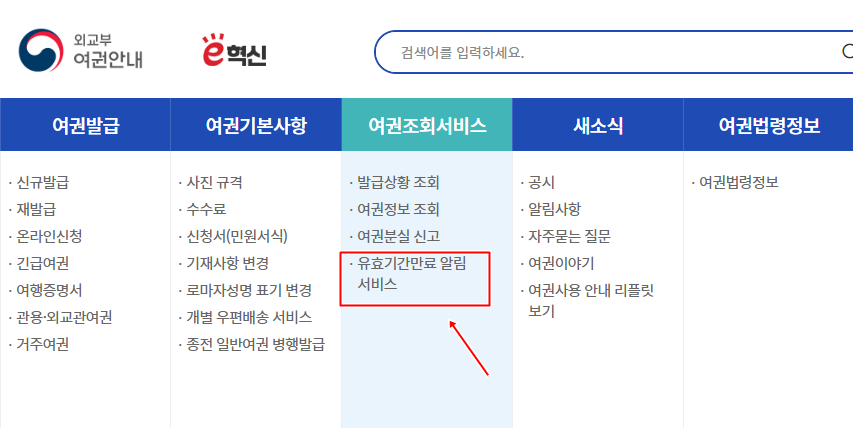 먼저 외교부 여권안내 사이트에서 상단에 보시면 여권조회서비스라는 카테고리가 있습니다. 여권 조회 서비스카테고리에서 유효기간만료 알림서비스 항목을 선택해 주세요.