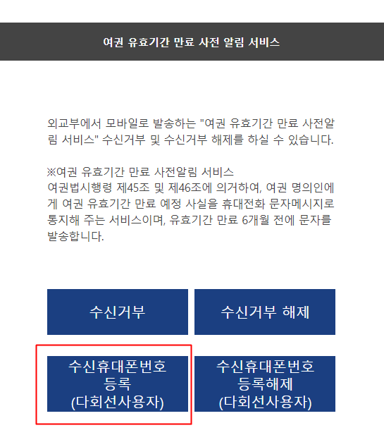 그다음 알림서비스를 신청하는것 이기 때문에 수신휴대폰번호 등록(다회선사용자)를 클릭해 주세요. 반대로 수신거부를 할 수도 있습니다.