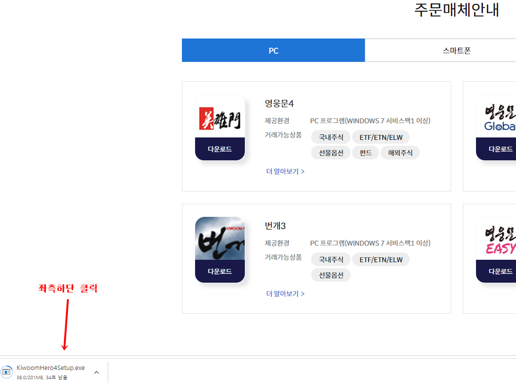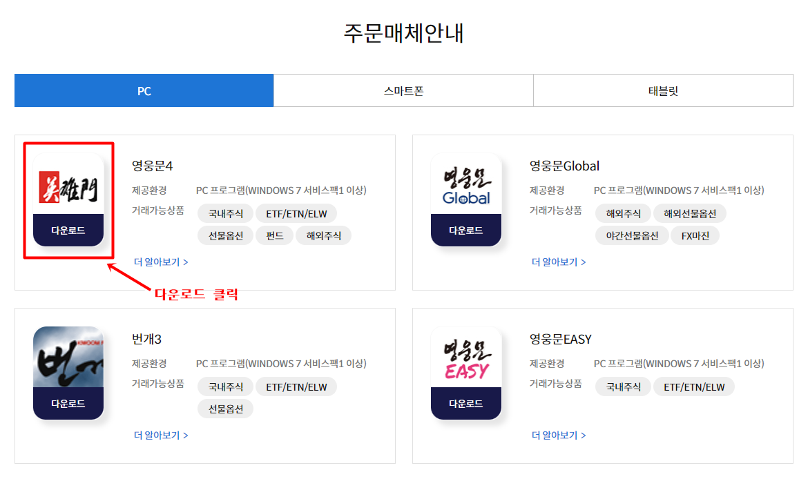 주문매체안내가 있고 총4가지의 PC용 HTS가 보일겁니다. 영웅문4, 영웅문 글로벌, 번개3, 영웅문 easy가 있는데요. 다른건 필요 없고 제일 많이 사용하는 주식 HTS 영웅문4를 클릭해 주시면 됩니다.