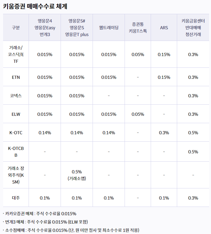 키움증권 주식 및 ETN, 코넥스등 매매수수료 표 입니다.