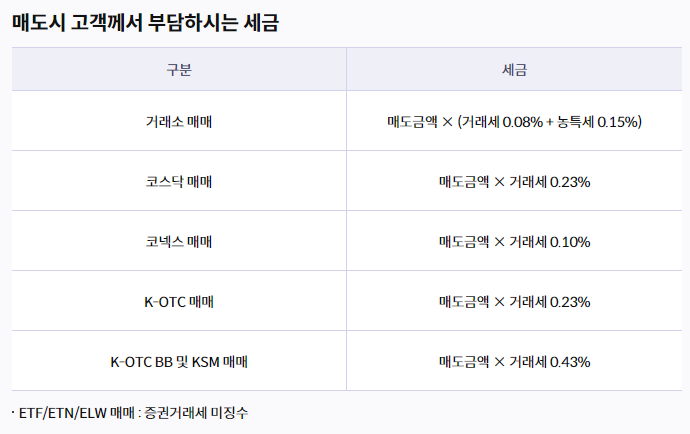 거래소로 불리우는 코스피 시장에서 주식 매도 세금은 매도금액 * 거래세 0.08%과 농특세 0.15%가 붙습니다. 쉽게 0.23%으로 계산하시면 되겠죠? 코스닥도 마찬가지로 매도금액의 0.23%를 주식매도세금으로 내야 합니다.