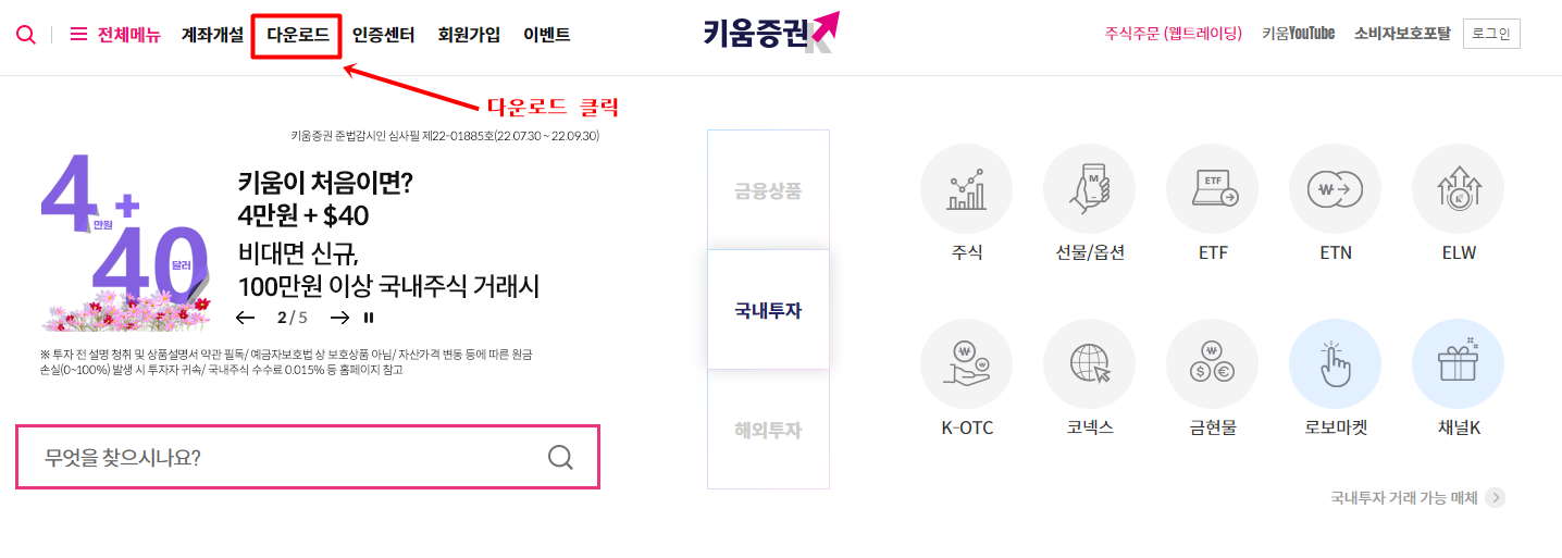 먼저 키움증권 사이트로 이동하시면 상단에 다운로드라는 카테고리가 있습니다. 여기를 클릭해 주세요.