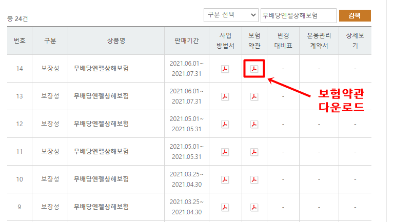 이렇게 조회를 하면 동양생명에서 판매한 무배당엔젤상해보험의 리스트가 쭉 나열이 됩니다. 내가 보험을 가입한 시기의 21년 6월 2일이기 때문에 해당 일자의 보험을 찾아 주세요. 그런 다음 보험약관의 아크로뱃리더 마크를 눌러주시면 다운로드가 완료 됩니다.