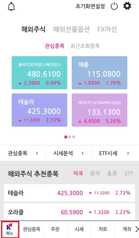 먼저 위 그림처럼 영웅문S 홈화면에서 좌측하단의 메뉴를 누르시고 관심종목을 누르시고 주식주문을 눌러 주세요.