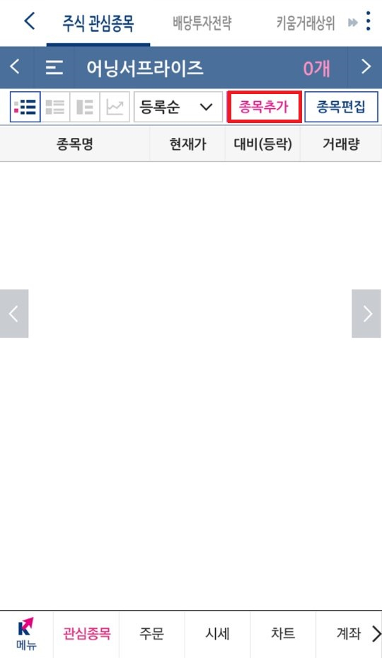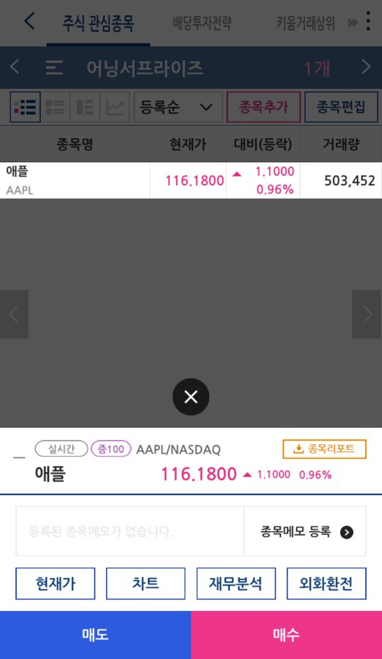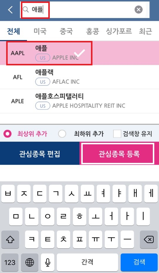 관심종목이 아니시라면 우측에 종목추가를 누르시고 사고자 하시는 종목을 검색 하세요. 가장 인기있는 해외주식인 애플을 예로 들겠습니다. 애플을 검색하시고 관심종목을 등록 해 주세요.