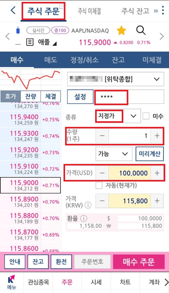 관심종목에 추가된 종목을 누르면 우측과 같은 화면으로 넘거가게 됩니다. 먼저 비밀번호를 누르시고, 장중이시면 지정가 선택, 내가 사고자하는 가격의 호가를 누르시던지 아니면 가격을 직접 입력하고 우측하단에 매수 주문 버튼을 눌러 주세요.