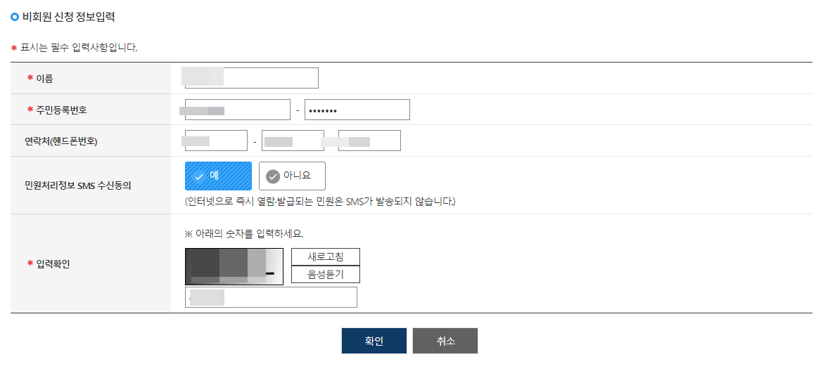 아래 그림과 같이 모두 동의하기를 눌러주시고, 우측과 같이 신청인의 인적사항을 기입해 주세요. 빨간 *표가 된 이름과 주민번호는 반드시 입력해야하는 사항이며, 휴대폰번호와 민원처리 SMS수신동의는 선택사항이지만 민원처리가 되고 알림을 받으셔야 하기 때문에 폰번호를 넣는것을 추천 드립니다.