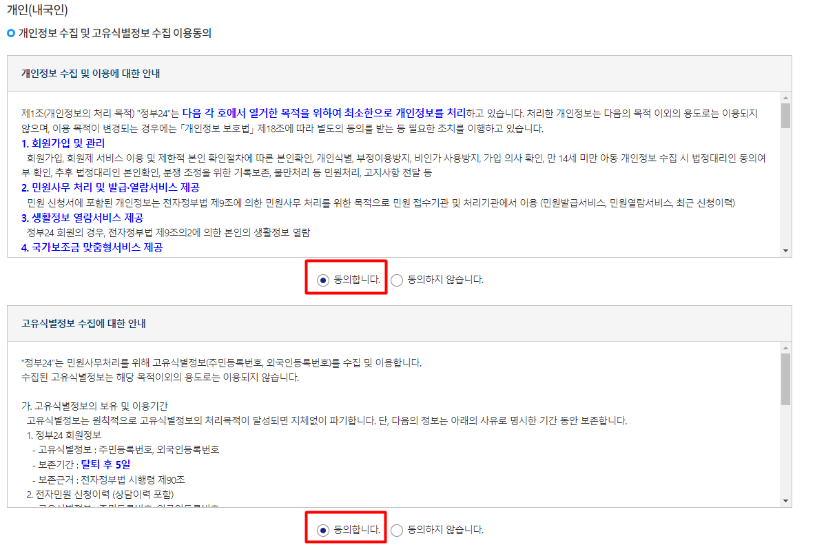 아래 그림과 같이 모두 동의하기를 눌러주시고, 우측과 같이 신청인의 인적사항을 기입해 주세요. 빨간 *표가 된 이름과 주민번호는 반드시 입력해야하는 사항이며, 휴대폰번호와 민원처리 SMS수신동의는 선택사항이지만 민원처리가 되고 알림을 받으셔야 하기 때문에 폰번호를 넣는것을 추천 드립니다.