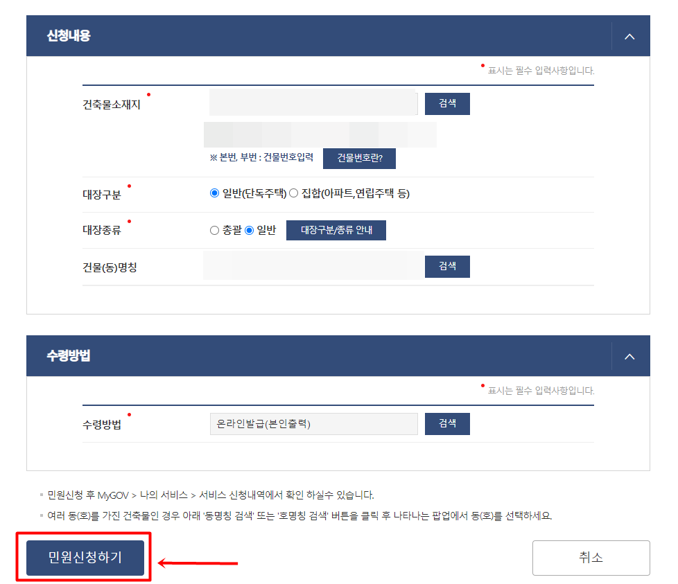 그다음 최상단의 건축물대장(발급)을 선택해 주시고요. 다음으로 넘어가시면 아래 건축물 소재지와 대장구분, 대장종류를 넣는란이 있습니다. 그리고 최하단의 민원신청을 눌러주시면 끝입니다.