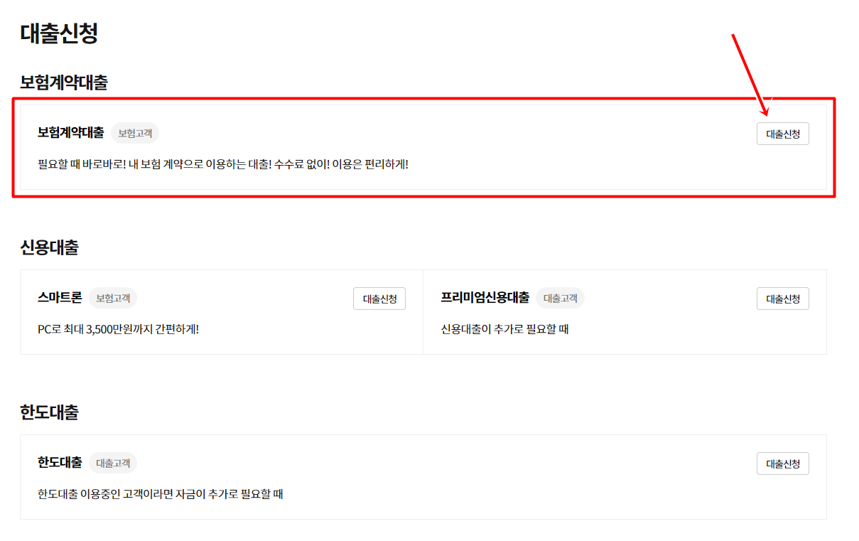 내가 가입한 보험계약을 담보로 가입하는 대출말고도 신용대출과 한도대출서비스를 제공하고 있으니 자금이 급하게 필요하신 분들은 추가로 신청해 보세요.