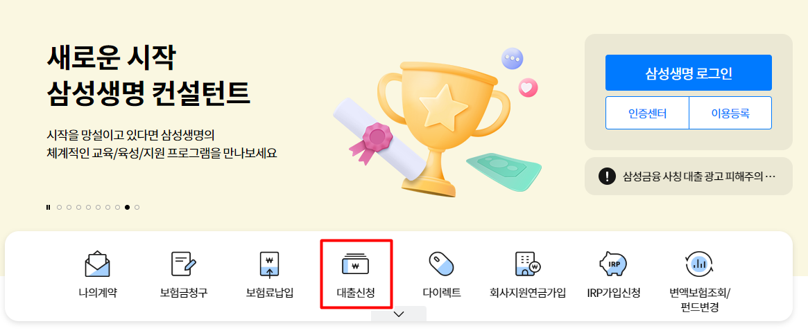 삼성생명 사이트에 접속하셨다면 아래 그림에 보이는것처럼 대출신청 카테고리를 클릭해 주세요. 가운데 있는 대출 카테고리 입니다.