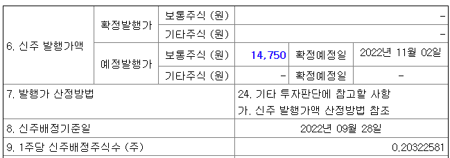 시초가가 하락하여 출발하는 이유는 신주발행가가 현재의 주가보다 낮기 때문에 그만큼 떨어져서 출발하게 되는것입니다. 예정발행가가 보이시죠? 예정발행가 수준에서 신주발행가가 결정되기 때문 입니다. 그러나 권리락 당일 곧바로 시초가가 회복하는 경우가 있으니 이때에 주식을 전부 매도 후 추후 신주인수권만 받아 팔아도 수익을 챙길 수 있으며, 또는 신주인수권을 가지고 유상증자에 참여하여 할인된 가격의 주식을 받을 수 있습니다. 이 주식 꿀팁은 아래에서 계속해서 설명 드리겠습니다.