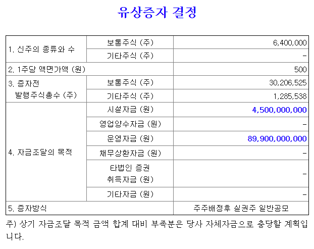 보통 시설자금에 들어가는 돈은 향후 높은 매출액으로 보답이 되지만 45억 규모는 단순 시설 보수정도의 규모로 보이고, 오스코텍이 현재 유동성 부족으로 운영자금에 높은 유상증자 금액 배정을 한것으로 보입니다.
